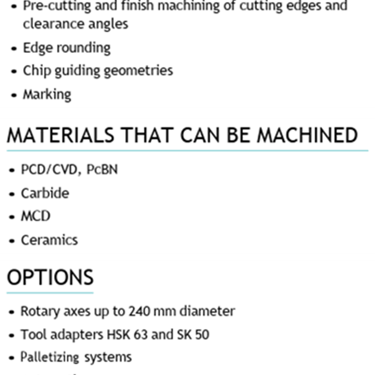PreCutter, dairesel boşlukların kesilmesi ve elmas takımların hassas ön işleme için bir sistemdir. PreCutter, seri üretime mükemmel şekilde uygundur ve isteğe bağlı olarak daha yüksek güçlü lazer kaynakları ve ek eksenlerle genişletilebilir.