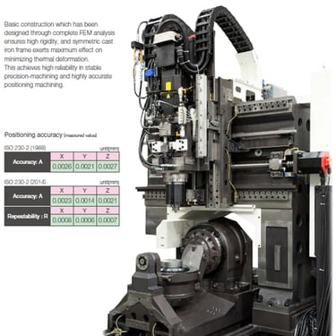 Rijit tasarım, Çift bilyalı Spindel, 5. Eksen opsiyonu, İş milinin kendinden regüleli yatak ön yükü, Isı stabilizasyonu, Doğrusal eksenlerin 4 mikrondan daha düşük konumlandırma hassasiyeti.